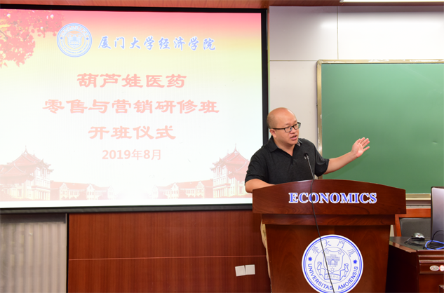 在开班仪式上,廖景峰主任首先代表厦门大学经济学院热烈欢迎多彩联盟医药零售与营销研修班的学员到厦大学习,并就厦门大学及经济学院的相关情况进行了介绍。他说,多彩联盟学员走进厦大就是厦大的校友,希望未来的日子能够关心、支持母校的发展,多提宝贵意见,同时他也祝大家在厦大学习期间学有所成、学有所获。