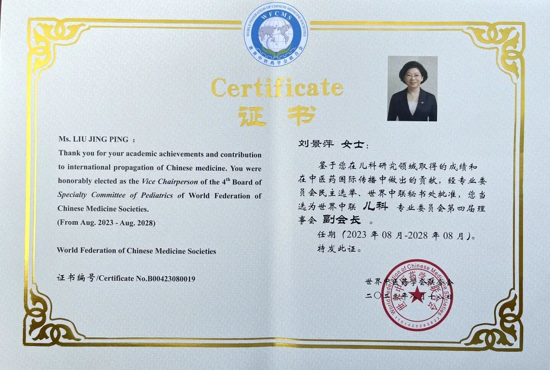 多彩联盟药业集团党委书记、董事长刘景萍当选世界中医药学会联合会儿科专业委员会第四届理事会副会长